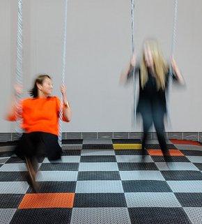 Naomi Kashiwagi wanted these swings to 'whoosh' when people used them. Accelerometers fitted to the bottom of the swing detect movement which is then used in a PD patch to control the volume of a sound file. Some appropriate maths changed the volume to swing control into an exponential function to give the right swooshing effect. The patch also looped through a text file controlled playlist of soundfiles prepared by Naomi.